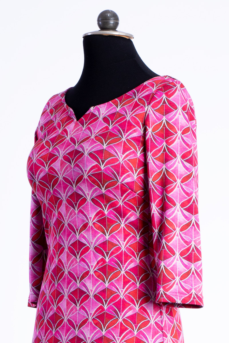 Kleid AUDREY zeichnet sich durch einen geradlinigen Schnitt in leichter A-Form aus. Der Halsausschnitt ist oval mit einem dekorativen „V“ in der Mitte.