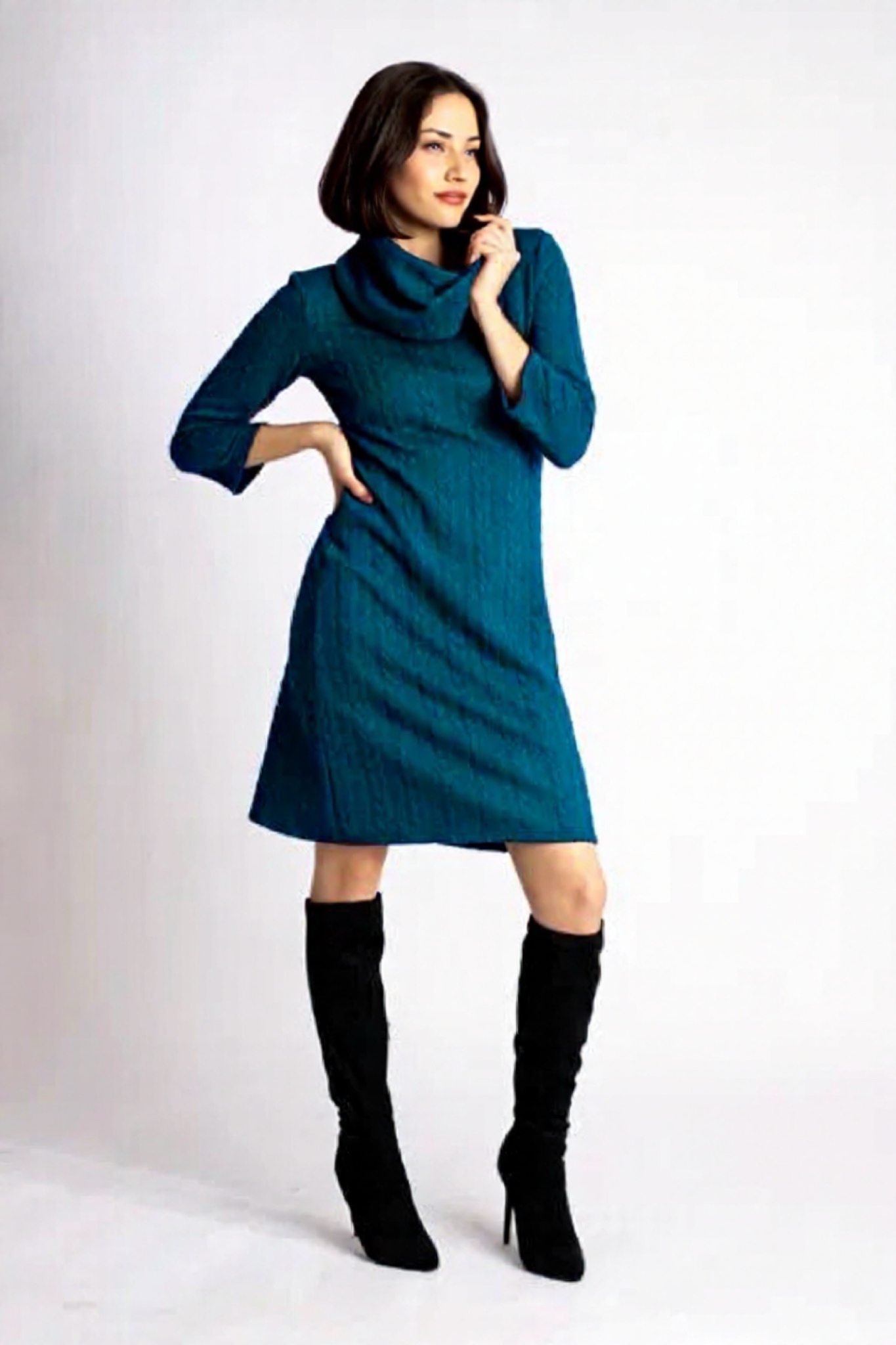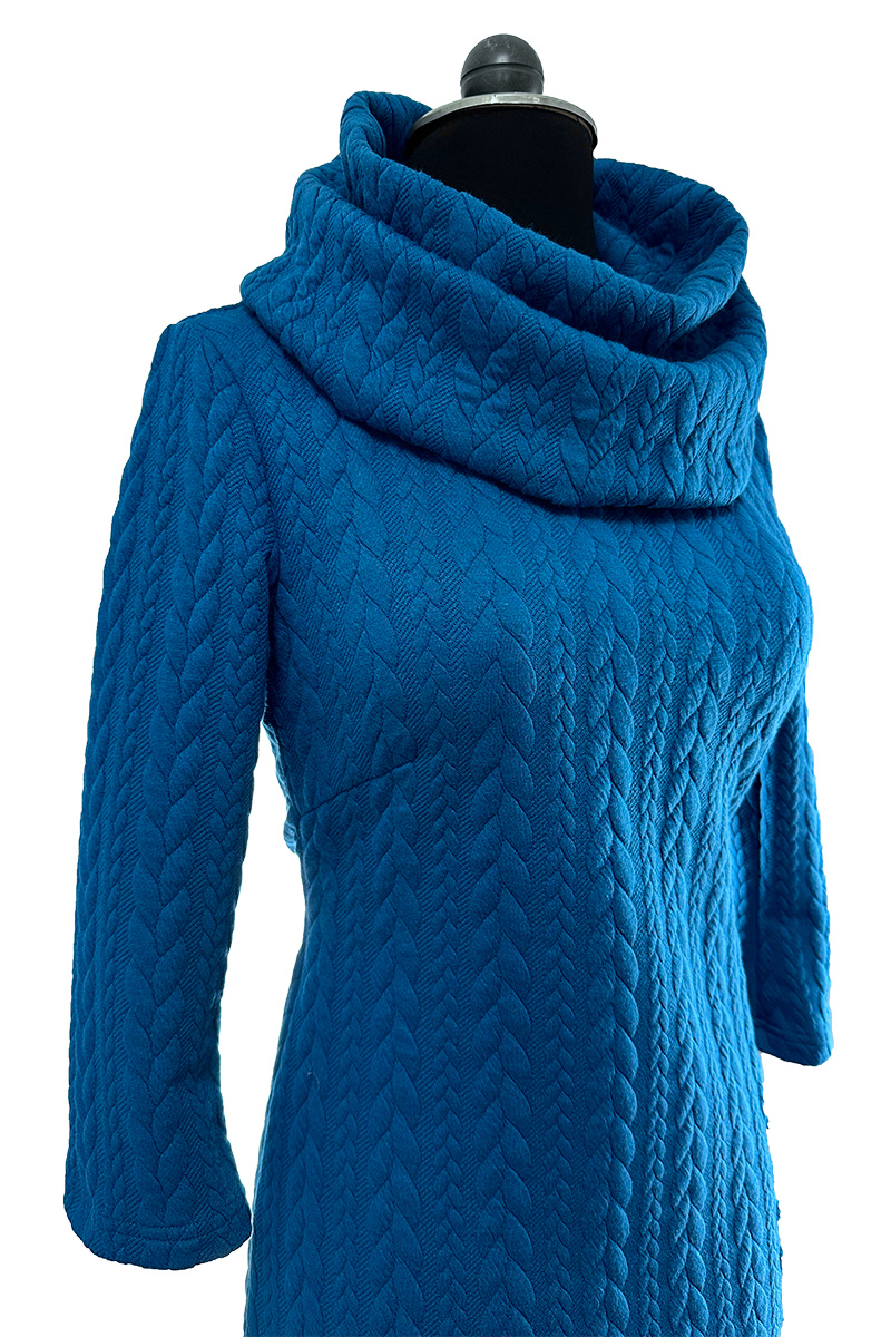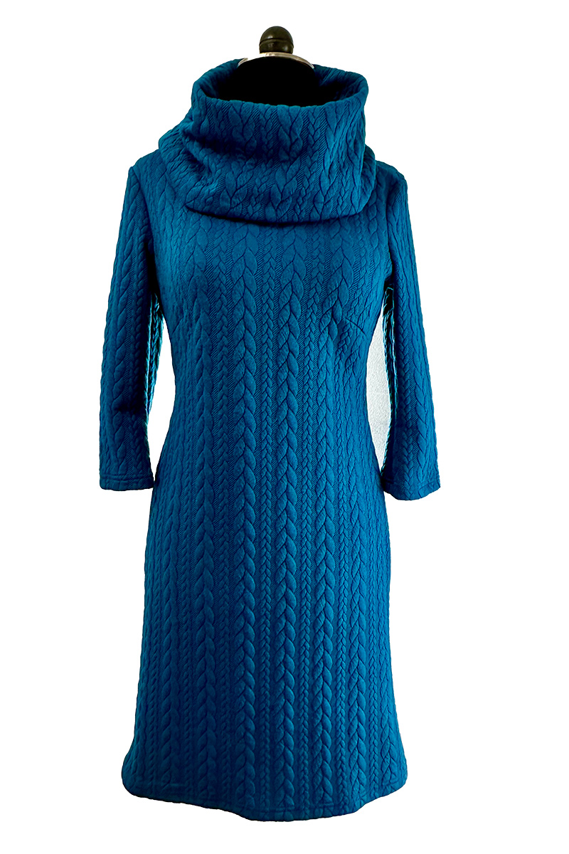 Es ist körpernah geschnitten und trotzdem super bequem. Der leicht ausgestellte Rock verleiht dem Kleid eine A-Silhouette. Der große, kuschelige Kragen ist dekorativ und wärmend. Innen mit einer Kontrastfarbe abgesetzt kann er spielerisch drapiert werden. Der Ärmel ist ¾-lang und am Saum leicht ausgestellt.
