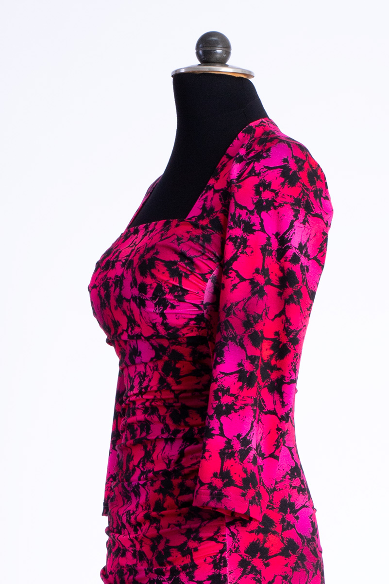 Die schmale Silhouette zaubert eine feminine Linie, während die Raffung im Vorderteil kleine Rundungen elegant kaschiert. Längsnähte formen und strecken optisch die Figur, und auch im Rücken sorgt eine feine Taillenraffung für perfekten Sitz.