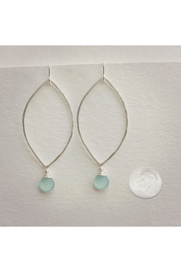 Gehämmerte Marquise-Ohrringe mit Halbedelstein-Farbakzenten. Unsere Creolen werden in unserem Schmuckstudio in New Orleans von Hand gefertigt, gehämmert und poliert. Die Ohrringe hängen ca. 5,7 cm. Alle Metalle sind aus Sterlingsilber. Tropfenförmiger Chalcedon-Edelstein ✹ Die Reifen werden in unserem Schmuckstudio in New Orleans von Hand geformt, gelötet, gefeilt, gehämmert und poliert.