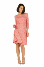 Der außergewöhnlich schöne Ausschnitt setzt ihr Dekolleté in Szene. Prinzessnähte sorgen für eine optimale Passform und strecken die Figur. Der raffinierte Gürtel Wendegürtel zaubert eine Wespentaille. Für eine ruhigere Vorderansicht kann der Gürtel auch im Rücken getragen werden. Weibliche Hüften werden von dem glockigen Rock weich umspielt. Der Saum hat eine schwingende Weite und lädt zum Tanzen ein. Die Ärmellänge ist dreiviertel lang.